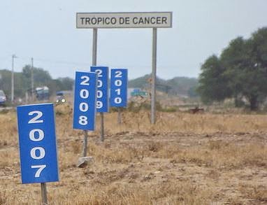 Trópico de Cancer é a linha limite norte - no dia de solstício de Verão a sombra fica na perpendicular, dando ideia de desaparecer em qualquer relógio solar. Como podemos ver na figura seguinte, e porque há sempre imprecisões naturais e mínimas, a linha tem-se deslocado aproximadamente 15 metros por ano em direcção ao equador:
